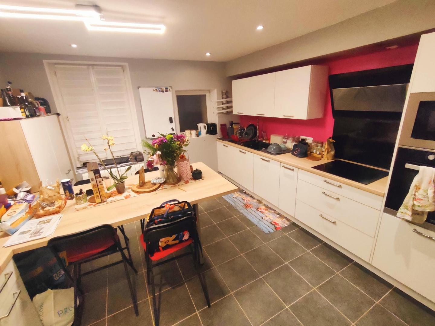 Composé au RDC d'un séjour doté d'un poêle à bois pour une meilleure maitrise énergitique, cuisine aménagée et équipée. Rangement sous l'escalier.