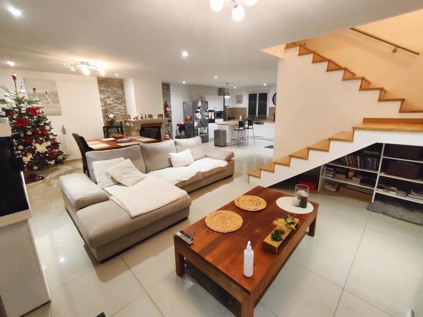 Comprenant au Rez de Chaussée Vaste pièce de vie traversante lumineuse, avec cheminée. Salon donnant sur cuisine ouverte aménagée et équipée, équipement de moderne de qualité ainsi qu'une buanderie avec nombreux rangement. WC indépendant.