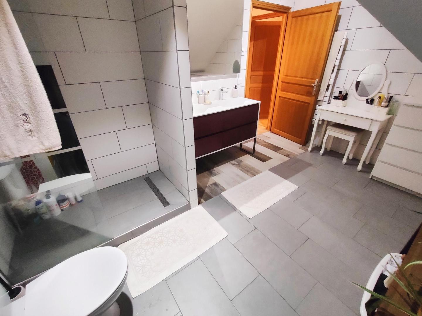À l'étage dégagement déservant 3 chambres dont deux déjà équipée de penderie, une grande salle de douche avec WC et vasque.