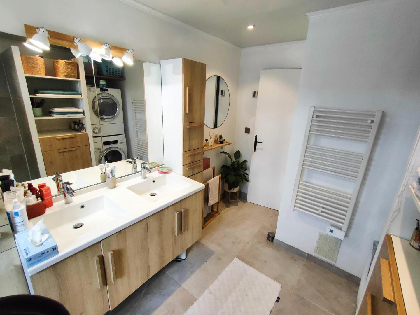 Rez de Chaussée surélevé comprenant de très nombreux rangements, entrée, séjour lumineux avec cuisine tendance aménagée et équipée, Chambre spacieuse avec tout un pan de mur dédié au rangement, salle d'eau avec douche à l'italienne, WC indépendant. À l'étage 4 chambres, salle de douche et WC indépendant. Sous Sol total accès jardin avec de beaux volumes dont garage et cellier.