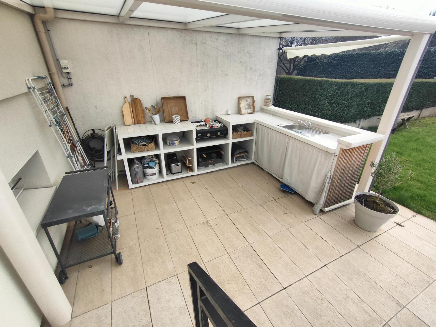 Terrasse exposée sud de 60m² et sa cuisine d'été avec un chalet de plus de 20 m².